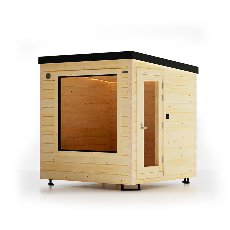 Hetki Cabin. En mångsidig innergårdsbyggnad du kan inreda till ett bekvämt utrymme för att varva ner, en arbetsplats eller till och med ett gästhus. Det fungerar som en oberoende enhet eller som ett bra kombination med Hetki Sauna eller Hetki Sauna Plus.