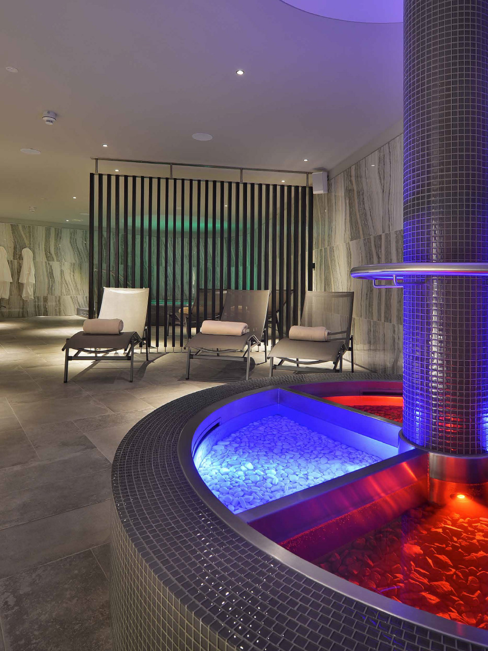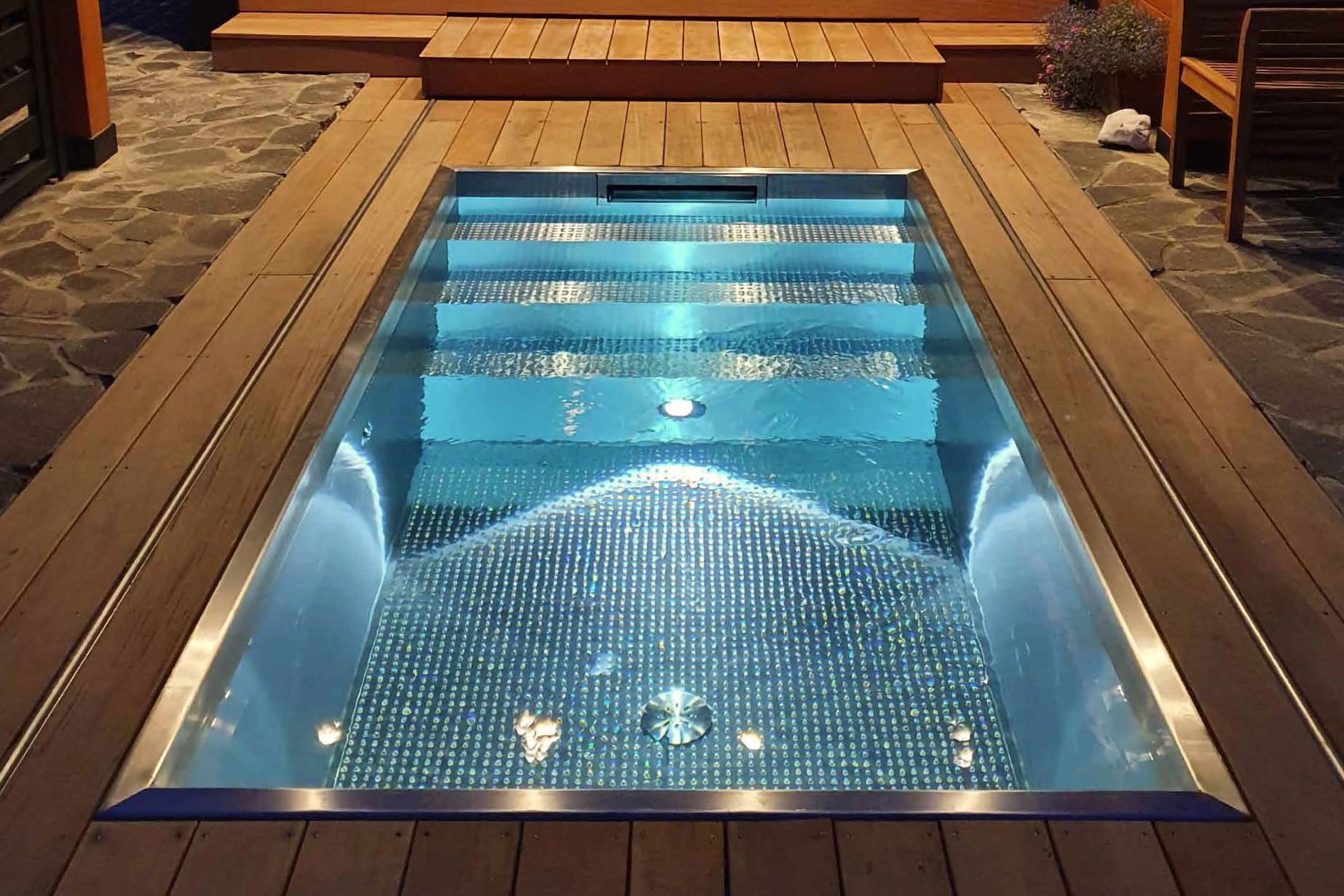 Vattenmunstyckena, som sitter i sidorna av karet, blåser en blandning av luft och vatten som masserar musklerna och ger en bra punktmassage. Det varma vattnet ökar blodcirkulationen och kroppstemperaturen samtidigt som det öppnar hudens porer. Intensiteten på munstyckena kan justeras efter hur mycket massage du önskar.